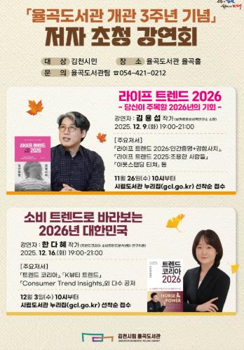 | ▲ 김천시 율곡도서관, 개관 3주년 기념 저자 초청 강연회 참가자 모집 |