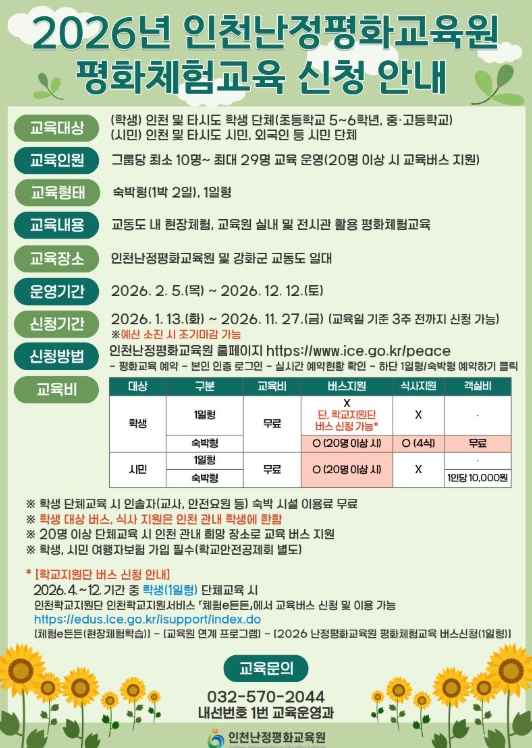 [뉴스노크=김인호 기자] 인천광역시교육청난정평화교육원은 2월 5일부터 12월 12일까지 학생과 시민을 대상으로 ‘2026년 평화체험교육’을 운영한다.