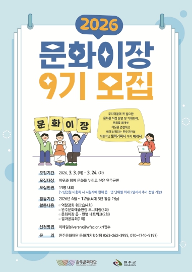 [뉴스노크=김인호 기자] (재)완주문화재단은 지역 문화 활성화를 이끌어갈 '2026 문화이장 9기' 13명을 오는 3월 24일까지 모집한다.