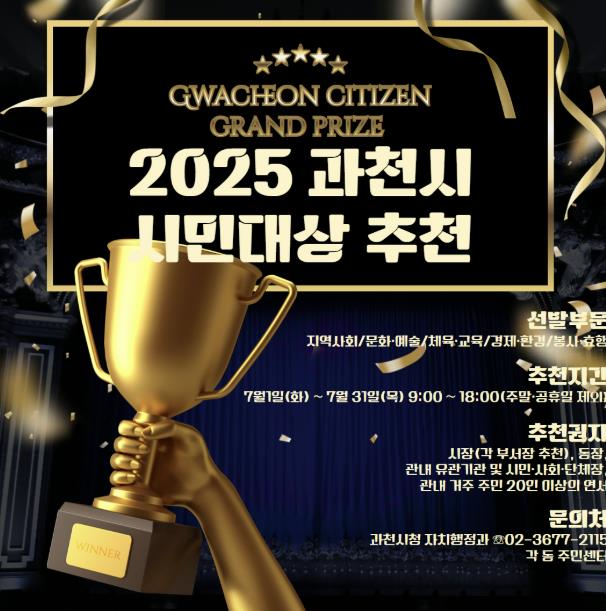 [뉴스노크=김인호 기자] 과천시는 7월 31일까지 ‘2025년 과천시 시민대상’ 후보자를 공개 모집한다. 이번 시민대상은 제40회 시민의 날을 기념해 지역사회 발전에 기여한 시민을 발굴하기 위한 것으로, 오는 10월 1일 기념식에서 시상할 예정이다.
