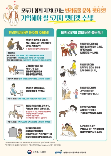 반려인이 지켜야 할 5가지 펫티켓으로는 ▲반려견과 외출 시 2m 이내의 목줄 및 인식표 착용하기 ▲2개월령 이상인 개에 대한 군청이나 동물 등록 대행 기관에 동물 등록하기 ▲외출 시 배변 봉투를 지참하여 배설물 수거하기 ▲맹견을 사육하려는 자는 군청에 맹견 사육 허가를 받고 맹견 법정 교육 이수 및 책임보험 의무적 가입하기가 있다.