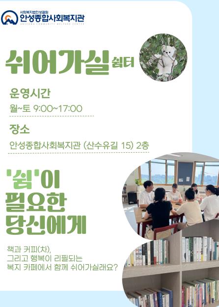 이번 사업은 안성시와 사회복지공동모금회에서 지원받아 '응답하라 2025 복지관 리프레쉬 - 쉬어가실'이라는 이름으로, 복지관 2층 공간을 개·보수하여 조성됐으며, 월요일부터 토요일까지 오전 9시부터 오후 5시까지 운영된다.