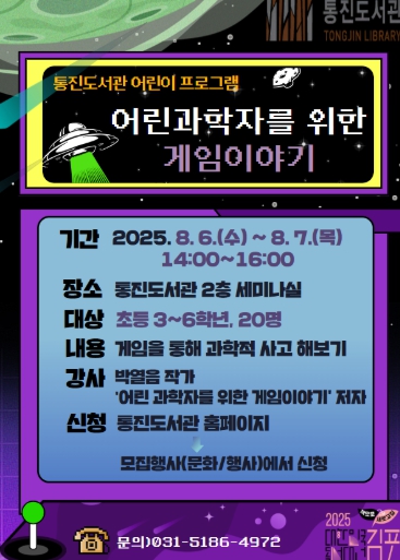 [뉴스노크=김인호 기자] 김포시 통진도서관은 오는 8월 6일부터 7일까지 이틀간 오후 2시부터 4시까지 초등학생을 대상으로 과학과 인문학을 쉽고 흥미롭게 접할 수 있는 특별한 프로그램 '어린 과학자를 위한 게임 이야기' 운영한다고 밝혔다.