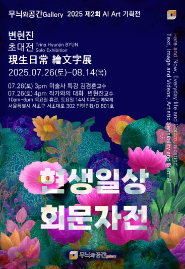 [뉴스노크=김인호 기자] AI 아트의 선구자로 손꼽히는 변현진 전남대 문화전문대학원 교수가 7월 26일부터 8월 14일까지 서울 서초구 ‘무늬와 공간 갤러리’에서 AI와 인간의 협업을 실험하는 개인전 ‘현생일상 회문자(現生日常 繪文字)’를 개최한다. ‘무늬와 공간 갤러리 2025 제2회 AI Art 기획전’ 중 하나로 마련된 이번 전시는 생성형 인공지능을 활용한 회화, 사진, 설치, 그래픽 등 다양한 매체가 융합된 작업을 통해 기술과 감각, 인간과 기계의 경계를 허무는 새로운 예술적 실천을 제시한다.
