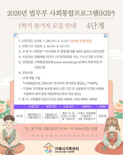 | ▲ 거제시가족센터, 2026년도 법무부 사회통합프로그램(KIIP) 1학기 참여자 모집 |