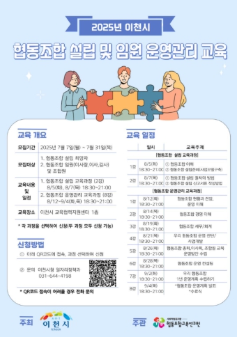 교육은 ‘협동조합 설립’과 ‘운영·관리’ 과정으로 나누어 진행되며, 모든 교육은 이천시 교육협력지원센터에서 실시된다. 설립 과정은 8월 5일과 8월 7일 총 2회, 운영·관리 과정은 8월 12일부터 9월 4일까지 매주 화요일과 목요일 총 8회에 걸쳐 진행된다.