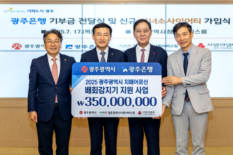 [뉴스노크=김인호 기자] 광주은행은 17일, 광주광역시청 비즈니스룸에서 강기정 광주광역시장, 구제길 광주사회복지공동모금회 회장 및 관계자가 참석한 가운데, 광주 지역 치매 어르신과 발달장애인의 실종 예방과 돌봄 사각지대 해소를 위한 기부금 3억 5천만 원을 기탁했다고 밝혔다.