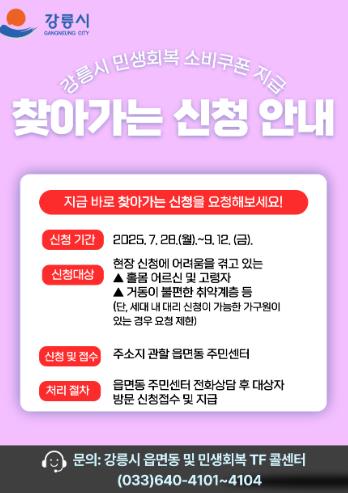 김홍규 강릉시장은 “거동이 불편하거나 홀몸 어르신 등 신청에 어려움이 있는 시민들이 ‘찾아가는 신청’으로 실질적인 도움을 받아 민생회복 소비쿠폰 사각지대를 해소할 수 있도록 최선을 다하겠다.”고 밝혔다.