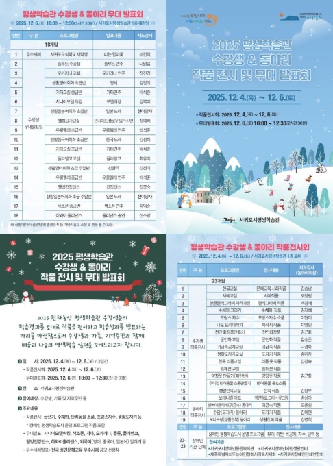 무대 발표회는 12월 6일 오전 10시부터 12시 30분까지 평생학습관 대강당에서 진행된다. 악기 연주, 댄스·퍼포먼스, 시니어 모델 워킹 등 18개 팀이 참여해 다양한 무대를 선보인다.