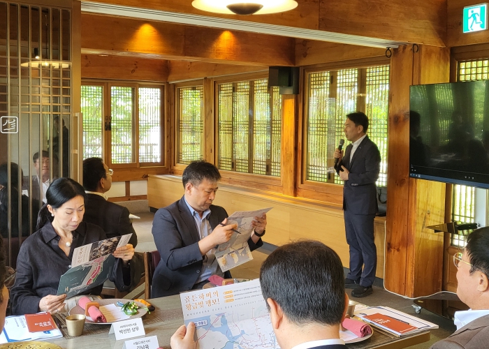 ▲ 인천항만공사 물류전략처장이 호텔 최고경영자를 대상으로 골든하버 복합지원용지를 홍보하고 있다 / 사진제공 = 인천항만공사 |