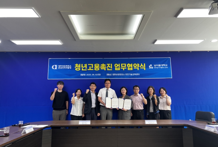 [뉴스노크=김인호 기자] 대한상공회의소 충남인력개발원(원장 권혁대)과 남서울대학교 대학일자리플러스센터(센터장 양정빈)는 지난 9월 2일 천안기술교육센터에서 청년고용 촉진 및 취업지원 협력에 관한 업무협약을 체결했다.
