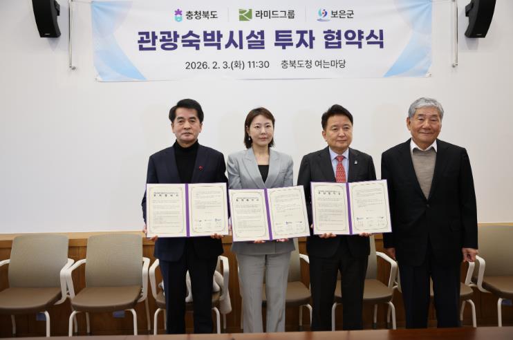이번 협약식에는 김영환 충북도지사와 최재형 보은군수, 문병욱 라미드그룹 회장, 문유선 라미드관광 대표이사 등이 참석했으며, 구병산관광지에 민간자본을 유치해 체류형 관광 기반을 구축하고 지역 관광 경쟁력을 강화하기 위해 마련됐다.