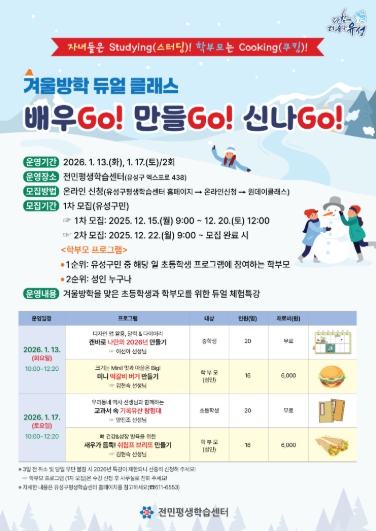 [뉴스노크=김인호 기자] 대전 유성구는 전민평생학습센터에서 1월 13일과 17일 양일간 초·중학생과 학부모를 위한 체험형 프로그램 ‘듀얼 클래스, 배우GO! 만들GO! 신나GO!’를 운영한다.