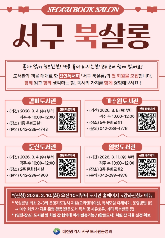 [뉴스노크=김인호 기자] 대전 서구 4개 공공도서관(갈마, 가수원, 둔산, 월평)은 주민들을 대상으로 책과 도서관을 매개로 한 성인 독서회 ‘서구 북살롱’을 운영한다고 5일 전했다.