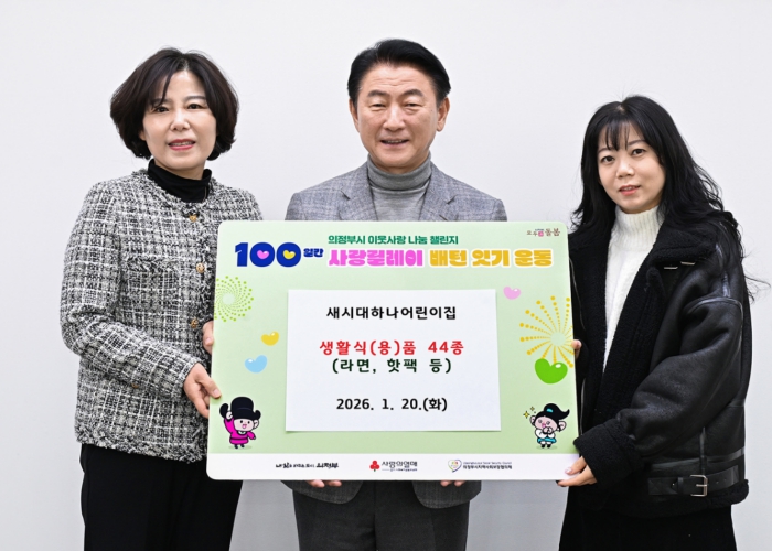 [뉴스노크=김인호 기자] 의정부시는 1월 20일 새시대하나어린이집이 ‘100일간 사랑릴레이 배턴 잇기’에 동참해 관내 저소득층을 위한 생활식(용)품 44종(라면, 핫팩 등)을 기부했다고 밝혔다.