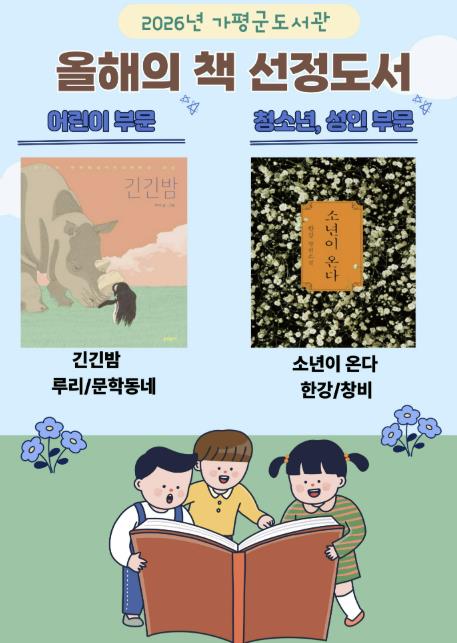 [뉴스노크=김인호 기자] 가평군도서관이 군민의 독서 문화 확산을 위해 ‘2026년 올해의 책’으로 루리 작가의 『긴긴밤』과 한강 작가의 『소년이 온다』를 선정했다.