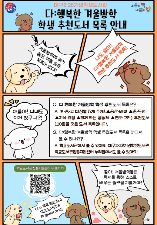 [뉴스노크=김인호 기자] 대구2·28기념학생도서관은 겨울방학을 맞아 학생들이 독서를 통해 정서적 성장과 사고력 신장을 도모할 수 있도록 학생 맞춤형 추천도서 목록인 ‘다:행복한 겨울방학 학생 추천도서 목록’을 배포한다.