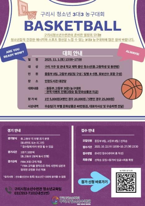 [뉴스노크=김인호 기자] 구리시청소년재단 청소년수련관은 '2025 구리시 청소년 3대3 농구대회' 참가 신청을 10월 22일부터 10월 27일까지 온라인으로 신청받는다고 밝혔다.