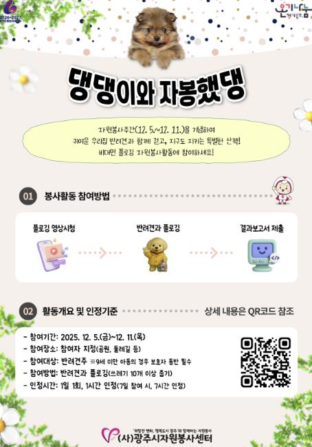 [뉴스노크=김인호 기자] 사단법인 광주시자원봉사센터는 국내 반려가구가 591만 가구로 전체 인구의 약 30%에 달하는 증가 추세를 반영하여, 반려동물과 함께 참여하는 비대면 가족 자원봉사활동 ‘댕댕이와 자봉했댕’을 오는 12월 5일부터 12월 11일까지 운영한다.