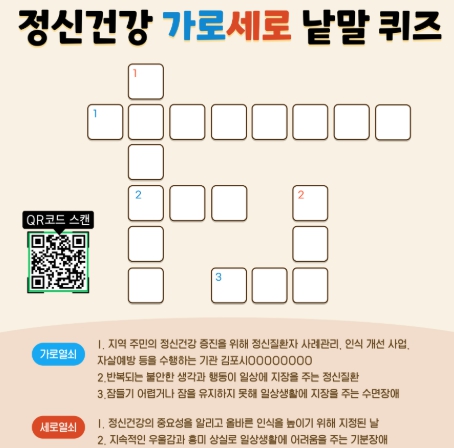 이번 캠페인은 정신건강에 대한 인식을 높이고, 올바른 정보를 쉽고 흥미롭게 전달하기 위해 ‘정신건강 낱말퀴즈’ 형식으로 기획됐다. 참여자는 큐알코드를 통해 온라인으로 퀴즈에 응시하며 정신건강 관련 용어를 자연스럽게 학습할 수 있다. 모든 문항을 맞힌 참여자에게는 소정의 기념품이 제공된다.