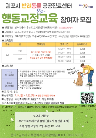 행동교정교육은 문제행동을 보이는 반려견을 키우고 있는 김포시민이라면 누구나 신청 가능하며 효율적인 교육 효과를 위해 1기수 당 8마리씩 1:1 맞춤교육으로 진행한다. 신청 시에 제출한 사전조사를 통해 반려견 양육환경과 문제행동 유형을 파악한 뒤 최종 교육 대상을 선정할 예정이다.