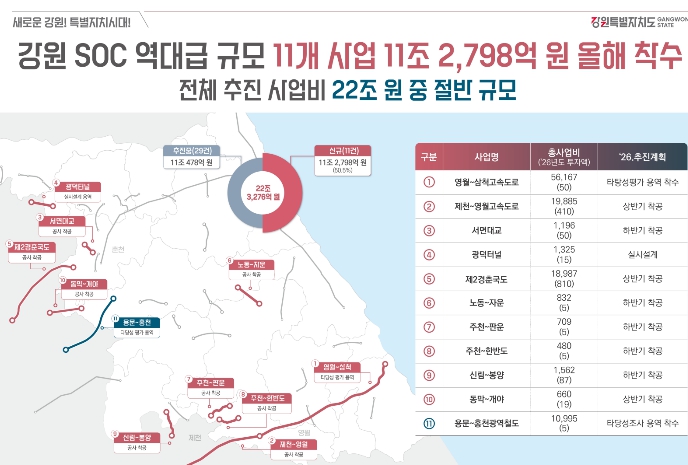 [뉴스노크=김인호 기자] 강원특별자치도는 현재 추진 중인 SOC 교통망 사업 22조 원 가운데 절반이 넘는 11조 원 규모의 사업을 올해 본격 착수한다고 밝혔다.