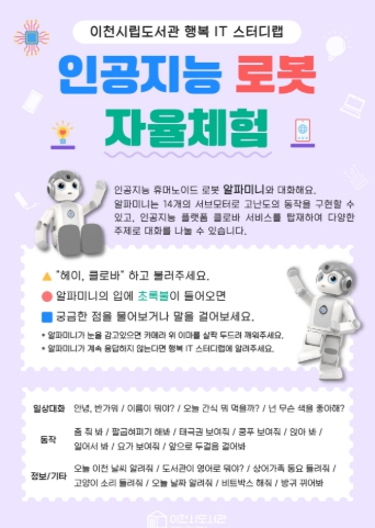 자율체험은 시립도서관 1층 로비에서 매주 화요일부터 토요일까지 오전 11시30분부터 오후 5시30분까지 운영한다. 체험에 활용되는 인공지능 로봇 ‘알파 미니’는 인공지능 플랫폼 클로바 서비스를 탑재하여 다양한 주제로 대화를 나눌 수 있고, 팔굽혀펴기와 요가 등 고난도의 움직임 구현이 가능한 휴머노이드 로봇이다. 특히 귀여운 외형으로 어린이뿐만 아니라 성인과 어르신에게도 친근하게 다가가, 도서관을 찾는 이용자들의 눈길을 끌 것으로 기대된다.