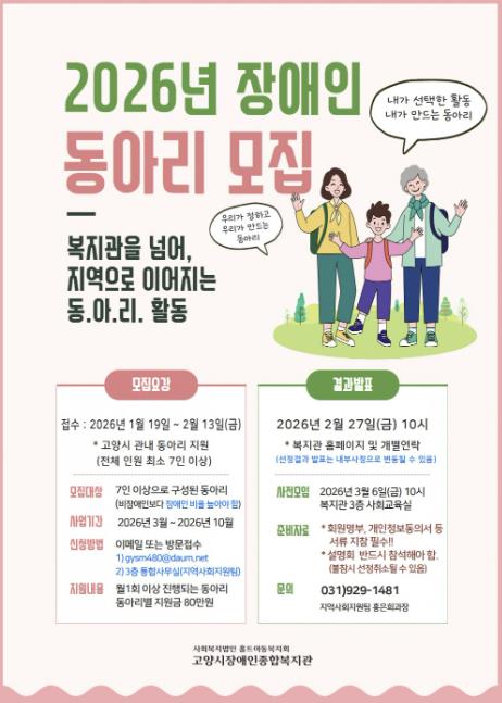 | ▲ 고양시장애인종합복지관 ‘2026년 장애인 동아리 모집’ 안내문 |