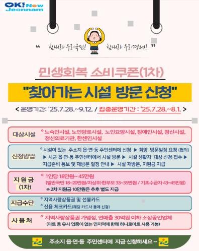 [뉴스노크=김인호 기자] 전라남도는 노인·장애인 등 취약계층의 민생회복 소비쿠폰 지급 사각지대 해소를 위해 오는 28일부터 8월 1일까지 지역 생활시설을 대상으로 ‘찾아가는 시설 방문 신청’을 집중 운영한다고 밝혔다.