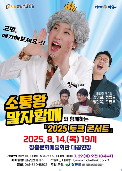 [뉴스노크=김인호 기자] 장흥군은 오는 8월 14일 목요일 저녁 7시 장흥문화예술회관 대공연장에서 소통왕 말자할매와 함께하는 「2025 토크 콘서트」를 개최한다고 밝혔다.