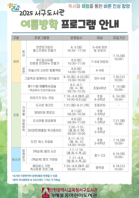 [뉴스노크=김인호 기자] 인천광역시교육청서구도서관은 여름방학을 맞아 7월 7일부터 8월 25일까지 청소년과 어린이를 위한 인성 함양 프로그램을 운영한다.