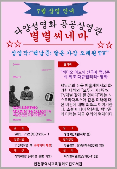 [뉴스노크=김인호 기자] 인천광역시교육청화도진도서관은 7월 ‘별별시네마’ 상영작으로 22일 오후 7시, 어맨다 킴 감독의 다큐멘터리 영화 ‘백남준: 달은 가장 오래된 TV’를 선보인다.