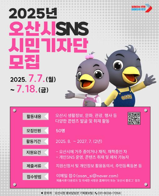[뉴스노크=김인호 기자] 오산시가 시민과의 소통을 강화하고 지역 소식을 시민의 시각으로 전하기 위해 ‘2025 오산시 SNS 시민기자단’을 모집한다.