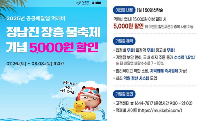 [뉴스노크=김인호 기자] 장흥군이 ‘제18회 정남진 장흥 물축제’의 성공 개최를 위해 공공배달앱 먹깨비 할인 이벤트를 추진한다.