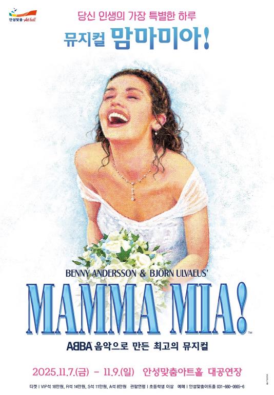 [뉴스노크=김인호 기자] 안성맞춤아트홀은 오는 11월 7일부터 9일까지 대공연장에서 세계적인 히트 뮤지컬 '맘마미아!'를 무대에 올린다. 세대를 초월한 명곡과 유쾌한 스토리로 사랑받아온 이번 작품은 남녀노소 누구나 즐길 수 있는 최고의 힐링 뮤지컬이다.