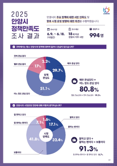안양시는 민선 8기 3주년을 맞아 시민을 대상으로 실시한 ‘안양시 정책만족도 조사’ 결과, 응답자 994명의 91.3%(잘하고 있다 17.1%, 잘하는 편이다 32.4%, 보통이다 41.8%)가 시정 운영 전반에 대해 긍정적으로 평가했다고 9일 밝혔다. 부정적인 평가는 8.7%(잘 못하는 편이다, 7.1%, 잘 못하고 있다 1.6%)에 그쳤다.