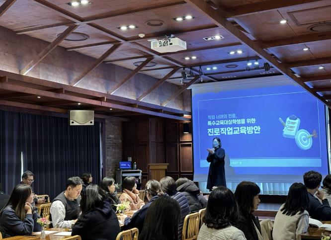 연수 주제는 ‘직업 너머의 진로, 특수교육대상학생을 위한 진로·직업 교육 방안’으로, 교사들은 강의와 소모임을 통해 실질적인 지도 방안과 교육적 방향을 나누고, 지역사회 기관과 연계한 사회전환 및 자립생활 지원 방안을 함께 고민하는 시간을 가졌다.