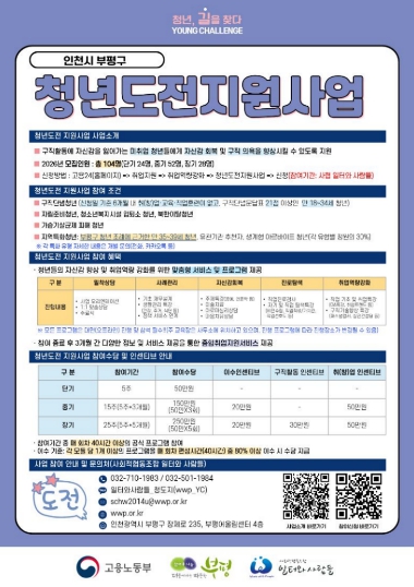 또한 ▲자립준비청년 ▲청소년복지시설 입‧퇴소 청년 ▲북한이탈청년 ▲가습기살균제 피해청년 ▲지역특화청년(부평구 거주 39세 이하)도 참여 대상에 포함된다.