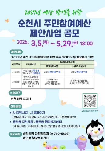 주민참여예산 제안 방법과 접수 기간 등 자세한 사항은 순천시 홈페이지 및 읍면동 행정복지센터를 통해 확인할 수 있다.