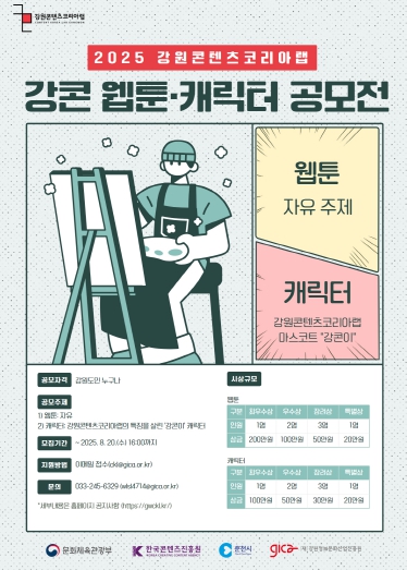 [뉴스노크=김인호 기자] 강원콘텐츠코리아랩에서 지역 창작자 발굴 및 콘텐츠 산업 활성화를 위한 '2025년 강원콘텐츠코리아랩 웹툰‧캐릭터 공모전'을 개최한다.