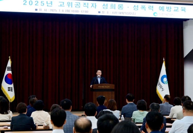 [뉴스노크=김인호 기자] 인천광역시는 7월 8일 시청 대회의실에서 유정복 시장을 비롯한 본청 및 소속기관의 고위공직자를 대상으로 ‘2025년 고위공직자 성희롱·성폭력 예방교육’을 실시했다고 밝혔다.