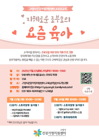 [뉴스노크=김인호 기자] 고양시 건강가정지원센터에서는 손자녀를 양육하는 조부모를 대상으로 7월 22일과 24일 양일에 걸쳐 ‘조부모 대상 손자녀 양육교육’을 진행한다.