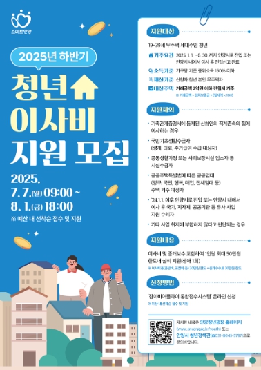 시는 2025년 1월 1일부터 6월 30일까지 안양시로 전입하거나 안양시 내에서 이사한 후 전입신고를 완료한 19세 이상 39세 이하의 청년 가구에게 1인당 최대 50만원 한도 내에서 이사비 및 중개보수비를 지원한다.