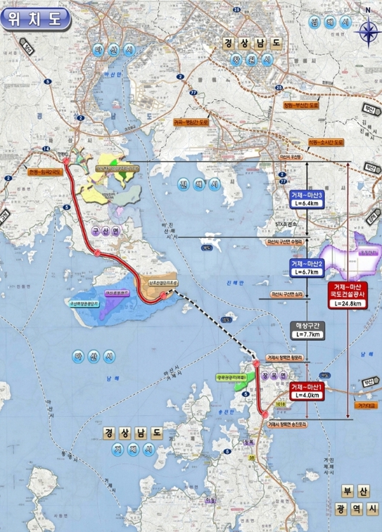 거제~마산 국도 5호선은 총 연장 24.8km(4차로 신설)로 창원시 마산합포구 현동에서 구산면 심리 구간 13.1km는 지난 2020년 이미 개통됐다.