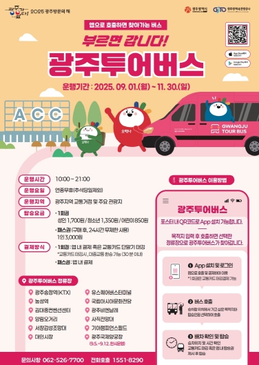 자세한 내용은 광주문화관광 오매광주 누리집(tour.gwangju.go.kr)과 광주관광공사 대표 누리집에서 확인할 수 있다. 광주투어버스 애플리케이션은 28일부터 애플 앱스토어와 구글 플레이스토어에서 내려받을 수 있다.