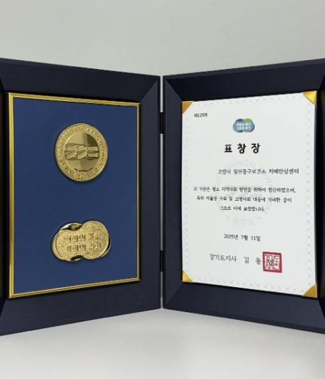 ▲ 고양시 일산동구보건소 치매안심센터가 경기도 인구정책 유공단체로 선정된 받은 경기도지사 표창장 |