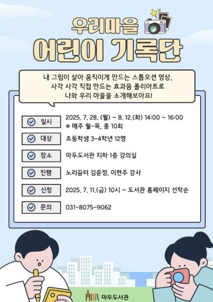 [뉴스노크=김인호 기자] 고양특례시 마두도서관은 오는 7월 28일부터 8월 12일까지 특성화 프로그램 ‘우리 마을 어린이 기록단’을 운영한다.