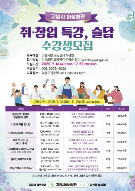[뉴스노크=김인호 기자] 고양시 고양시 여성회관이 지역 주민들의 능력 개발을 돕는‘취·창업 특강, 슬담’프로그램의 수강생을 모집한다.