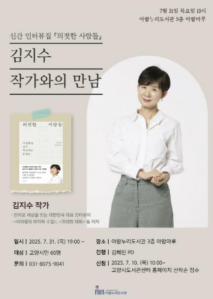 [뉴스노크=김인호 기자] 고양특례시 아람누리도서관은 오는 7월 31일 목요일 오후 7시, 아람누리도서관 3층 아람마루에서'의젓한 사람들'의 저자 김지수 작가를 초청해 시민들과 함께하는 만남의 시간을 마련한다.