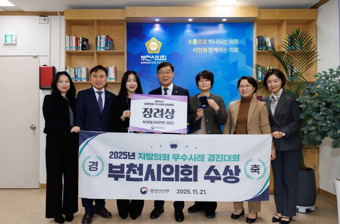 [뉴스노크=김인호 기자] 부천시의회는 21일 울산전시컨벤션센터에서 열린 행정안전부 주관 ‘2025년 지방의회 우수사례 경진대회’에서 의정활동 분야 ‘장려상’을 수상했다.